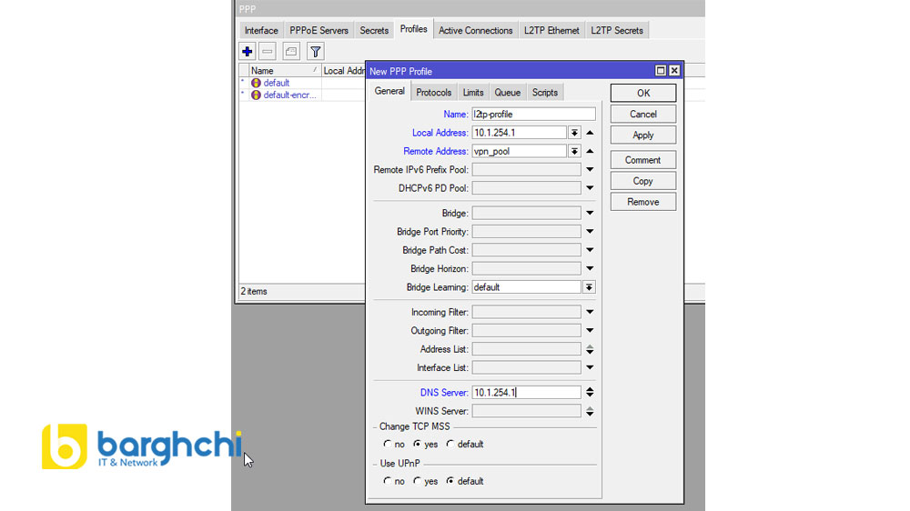 حالا باید مشخص کنیم کاربرانی که به VPN وصل میشوند چه تنظیماتی دریافت کنند. این کار با ساخت یک PPP Profile انجام میشود.