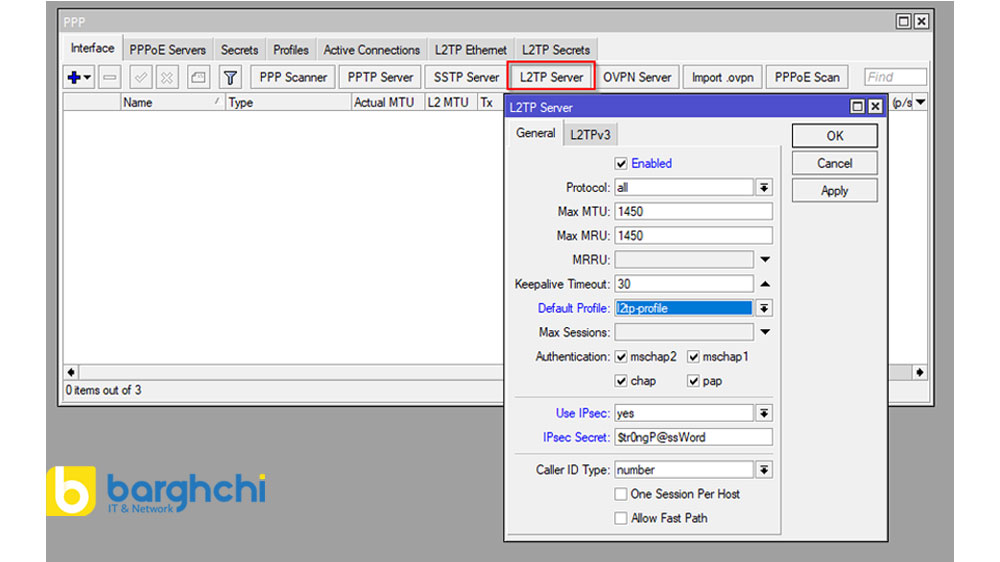 L2TP از Layer 2 Tunneling Protocol برای ایجاد تونل VPN استفاده میکند و IPsec برای افزایش امنیت این تونل استفاده میشود. این پروتکل تاحد زیادی امنیت دارد و گزینهای معقول برای ایجاد تونلهای VPN در میکروتیک است.