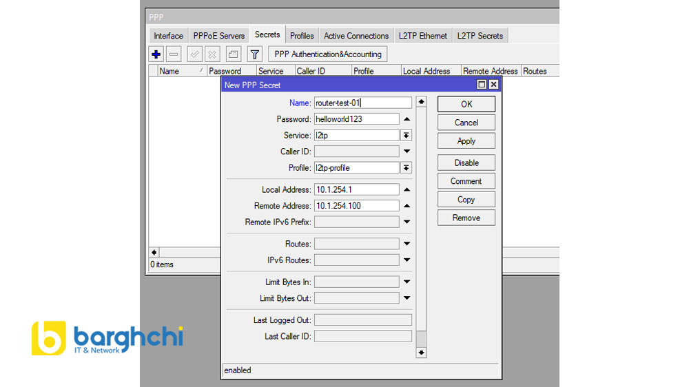 در این مرحله یک کاربر برای اتصال VPN میسازیم تا کلاینت با نام کاربری و رمز عبور بتواند به سرور L2TP وصل شود. این کاربر در MikroTik داخل بخش PPP Secrets ذخیره میشود.