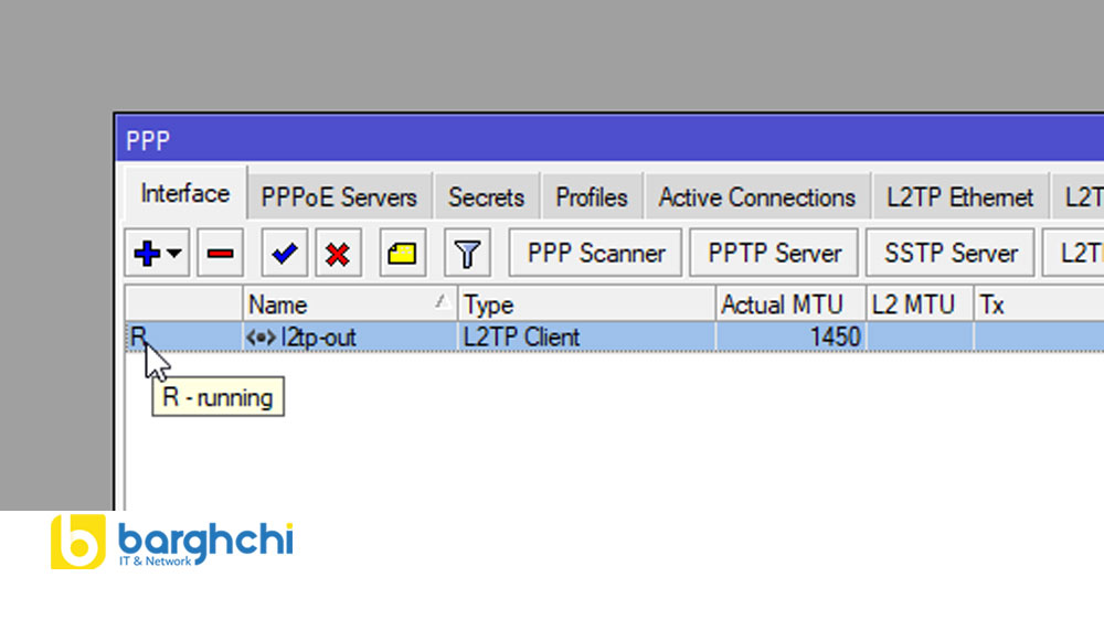 📌 حرف R مخفف Running است و نشان میدهد کلاینت با موفقیت به سرور VPN وصل شده و تونل فعال است. اگر این علامت ظاهر نشد، یعنی اتصال برقرار نشده و باید تنظیمات نام کاربری، رمز عبور یا IPsec Secret را بررسی کنید.